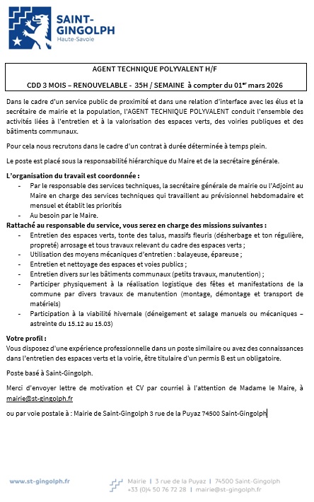 emplois et appels d'offre Offre(s) d'emploi de la commune La commune recrute : un agent technique polyvalent, à compter du 01er mars 2026, offre détaillée ci-dessous. Appels d'offres A louer : local à usage médical Délégation de Service public - Bar-restaurant de la Plage